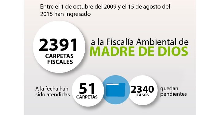 Según información publicada en el portal Alerta Ambiental, en los últimos 6 años solamente el 2% de denuncias ambientales han sido atendidas. De un total de 2391 carpetas fiscales ingresadas a la Fiscalía Especializada en Materia Ambiental de Madre de Dios entre el 1 de octubre del 2009 y el 15 de agosto del 2015, solamente 51 carpetas han sido atendidas. 2340 casos aún están pendientes, a partir de información proporcionada por la Coordinadora de Fiscalías Especializadas en Materia Ambiental.