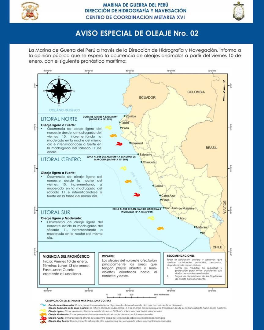 La Marina de Guerra del Perú emitió un comunicado en el que alertan a los usuarios del mar sobre la llegada de nuevos oleajes anómalos en la costa peruana. Este fenómeno se presentará desde el viernes 10 hasta el lunes 13 de enero y afectará, principalmente, en las áreas con «playas abiertas o semiabiertas orientadas hacia el noroeste y oeste».
