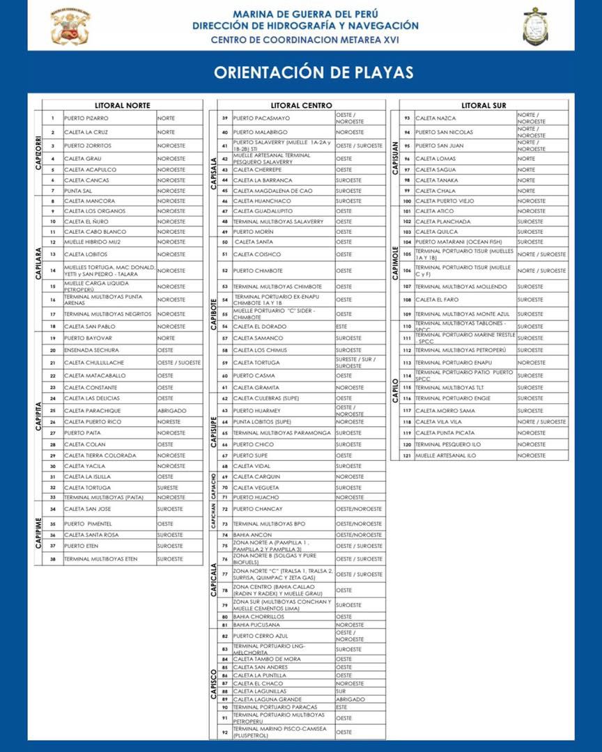 - Centro (sur de Salaverry hasta San Juan de Marcona): oleaje ligero desde la noche del viernes 10 que se incrementará a moderado durante la madrugada del sábado 11, hasta intensificarse a fuerte durante la tarde de ese día.