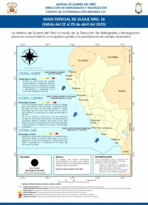 El Aviso Especial de Oleaje N.º 16, publicado por la Dihidronav, advierte que este fenómeno afectará principalmente a zonas con playas abiertas o semiabiertas, por lo que “se recomienda a los Gobiernos Regionales, Locales, Capitanías de Puerto y empresas de la comunidad acuática tomar las medidas de prevención necesarias para evitar accidentes y/o daños personales o materiales”.