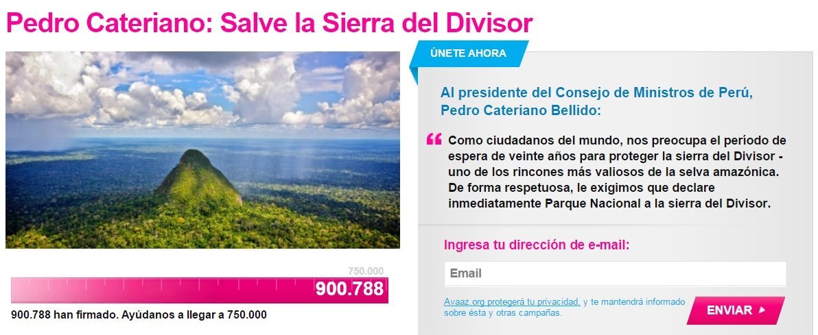 El establecimiento de Sierra del Divisor como Parque Nacional no solo es de interés de los peruanos, sino también de la comunidad internacional, así lo demuentran las más más de 900 mil firmas que ha logrado un petición publicada en el portal Avaaz.org.
