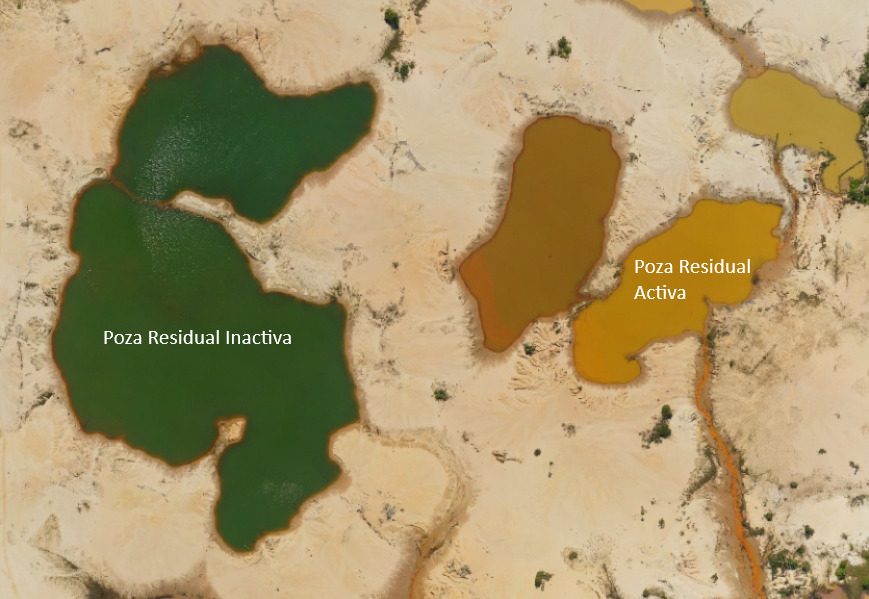 Otra de las revelaciones de las imágenes satelitales son el incremento de pozas residuales, donde se concentran sedimentos removidos del suelo y elementos contaminantes utilizados durante la extracción del oro, como el mercurio. En el análisis realizado, se puede determinar si una poza está activa de acuerdo con el color: cremas cuando están activas, por la constante remoción de sedimentos; y verde azulado, producto de la aparición de algas colonizadoras al no haber actividad en la poza.
