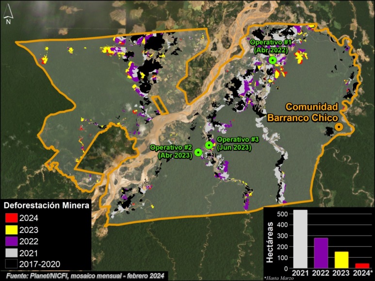 El análisis del MAAP mostró que la deforestación minera entre 2021 y 2024 disminuyó en la comunidad nativa Barranco Chico, en comparación a años anteriores (2017-2020), mientras que en este mismo periodo hubo un amento en San José de Karene, Tres Islas y Boca Inambari.