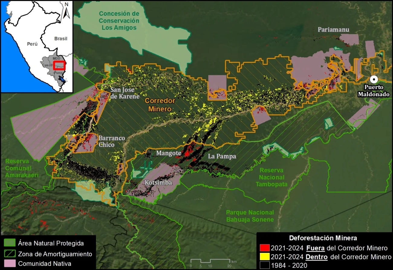 El Proyecto Monitoreo de la Amazonía Andina (MAAP por sus siglas en inglés), iniciativa de Conservación Amazónica (ACCA), informó que la minería generó la deforestación de 30 846 hectáreas de bosque primario en la región de Madre de Dios. Según las imágenes satelitales del estudio Minería de oro en la Amazonía peruana sur, resumen 2021-2024, el área deforestada es el equivalente a 43 mil campos de fútbol profesionales.