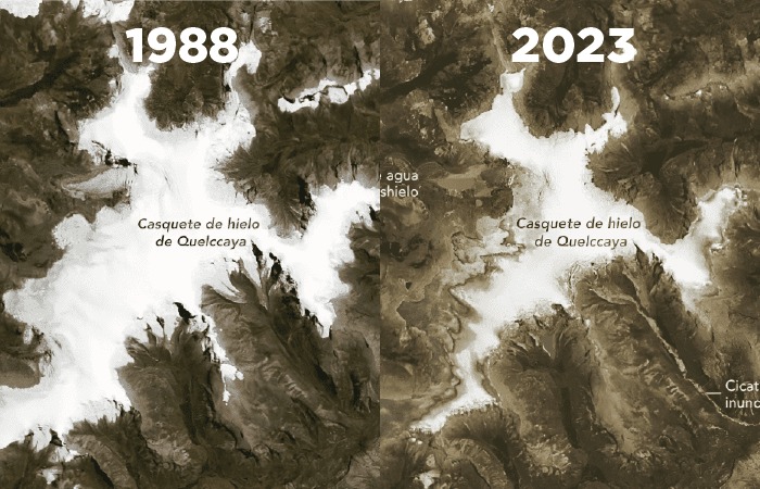 - Imágenes satelitales de 1988 y 2023 indican que el retroceso glaciar del nevado tropical más extenso del mundo es, en promedio, de 14 metros por año