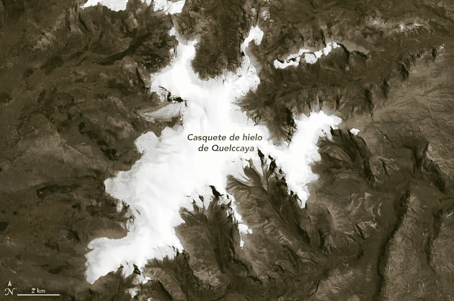 Imágenes satelitales publicadas por la Administración Nacional de Aeronáutica y el Espacio (NASA) revelan que el Quelccaya, considerado el nevado tropical más extenso del mundo, ha perdido unos 18 kilómetros cuadrados de hielo en los últimos 35 años.