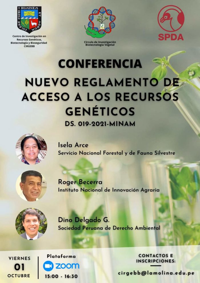 El próximo viernes 1 de octubre se realizará la conferencia sobre los cambios realizados en la actualización del Reglamento de Acceso a los Recursos Genéticos y sus derivados. El evento virtual es organizado por el Centro de Investigación en Recursos Genéticos, Biotecnología y Bioseguridad (CIRGEBB), el Círculo de Investigación Biotecnología Vegetal, y la Sociedad Peruana de Derecho Ambiental (SPDA).
