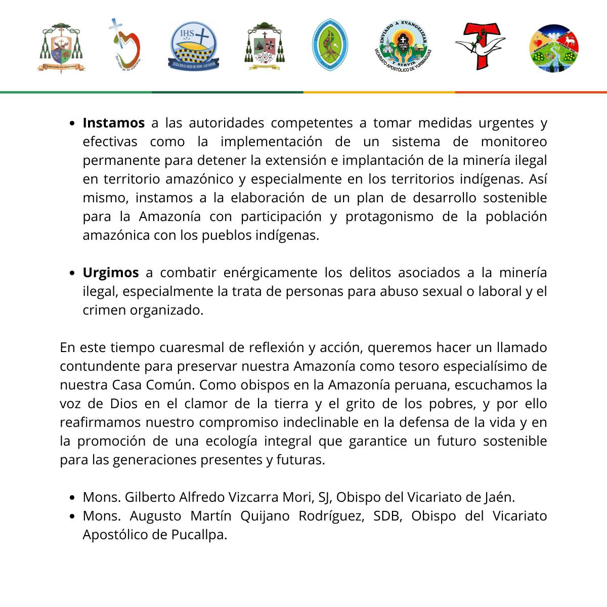 Ante esta situación, los religiosos condenan “la inacción por parte de las autoridades” y exigen que el Estado asuma su responsabilidad y brinden la protección efectiva a las comunidades afectadas para “garantizar su seguridad, así como sus derechos territoriales y ambientales, especialmente de las comunidades nativas”.
