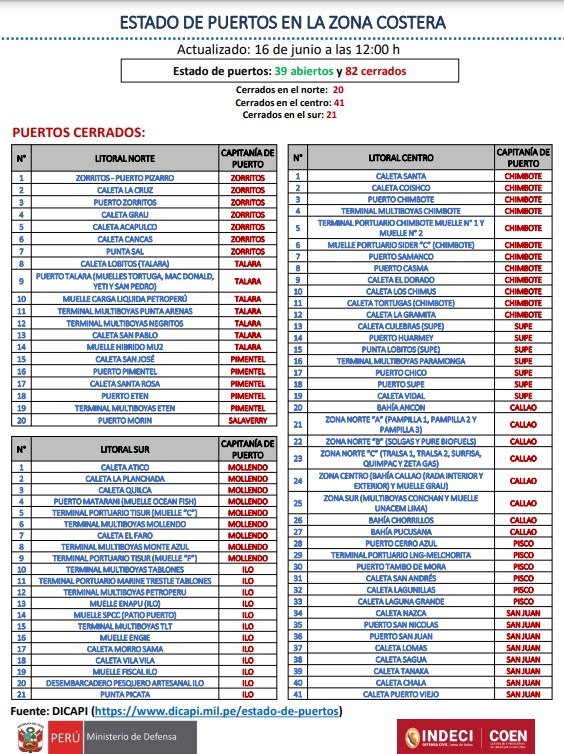Desde el Instituto Nacional de Defensa Civil (Indeci) se publicó la lista de puertos cerrados por oleajes anómalos desde el 13 de junio: