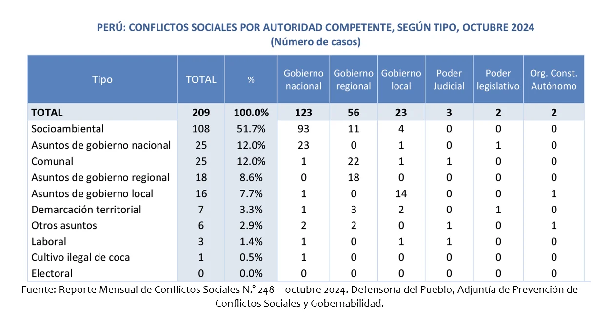 En el Perú tenemos un grave problema público relacionado con la alta conflictividad social que afecta el ejercicio de los derechos de las personas en el territorio. El Reporte de Conflictos Sociales de la Defensoría del Pueblo de octubre de 2024 determinó la existencia de 209 conflictos sociales: 163 activos de los cuales 89 están en proceso de diálogo y 46 latentes.