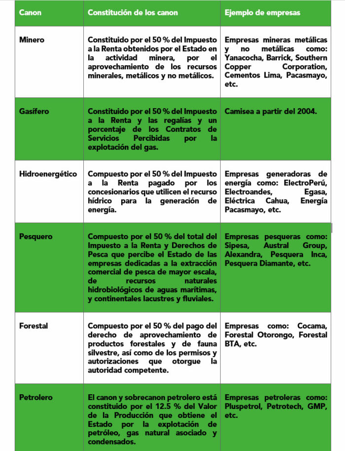 Ahora bien, a la fecha existen 6 tipos de canon: minero, gasífero, hidroenergético, pesquero, forestal y petrolero.