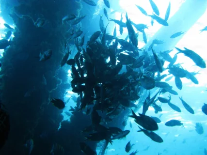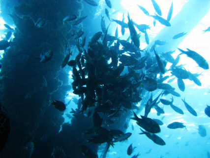 Por otro lado, el efecto “sombra” que genera la parte externa de la plataforma, favorece la congregación de grandes cardúmenes de peces pelágicos (los que viven nadando constantemente en la columna de agua), muchos de ellos especies migratorias que buscan puntos geográficos especiales para descansar en sus viajes. En la plataforma MX1 se registra con frecuencias cardúmenes de jureles (Trachurus murphyi), caballa (Scomber japonicus), fortunos (Seriola rivoliana y Seriola lalandi), agujillas (Hyporhamphus spp.), boca dulce (Kyphosus analogus), choclos (Sectator ocyurus), Barracudas (Sphyraena idiastes), además de visitas circunstanciales de mantas gigantes (Mobula birostris) y tiburón ballena (Rhincodon typus). En superficie se tiene la presencia casi constante de grandes lobos marinos (Otaria byronia) y numerosas aves guaneras que usan la estructura como lugar de reposo.