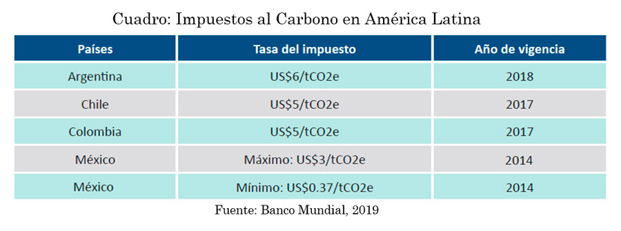 Actualmente, 18 mercados emergentes y economías en desarrollo vienen implementando PC. En el caso de estos países, su implementación puede ser beneficiosa debido a que: (i) alienta políticas distributivas para reducir desigualdad, como la sustitución gradual de impuestos regresivos, (ii) ayuda a reducir los índices de formalidad, al enfocarse a una base tributaria formal, y, sobre todo, al incorporar una señal de precio al uso de la energía en las primeras etapas de la cadena de producción, es más difícil de evadir que los impuestos sobre la renta, (iii) los impuestos al carbono son sencillos de administrar porque utilizan la infraestructura institucional de los impuestos a los combustibles, y (iv) los ingresos por la eliminación de subsidios a los combustibles o la implementación de precios al carbono, generarían ingresos que podrían utilizarse para promover el desarrollo humano (Vargas y Trinidad, 2019, p.11).