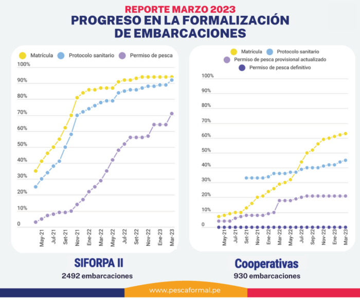 De acuerdo con un informe compartido por el portal pescaformal.pe, existen 3422 embarcaciones en ambos procesos de formalización, de las cuales 930 están en el régimen de cooperativas y 2492 en el régimen de Siforpa II. Hasta marzo de este año, el 86 % de las 3422 embarcaciones ya cuentan con matrícula y cerca de 200 embarcaciones están en proceso de obtenerla. Se estima que el progreso de estos trámites permitiría alcanzar el 92 % de matrículas emitidas. La obtención del certificado de matrícula que otorga la Dirección General de Capitanías y Guardacostas (Dicapi) es un prerrequisito para obtener el permiso de pesca.