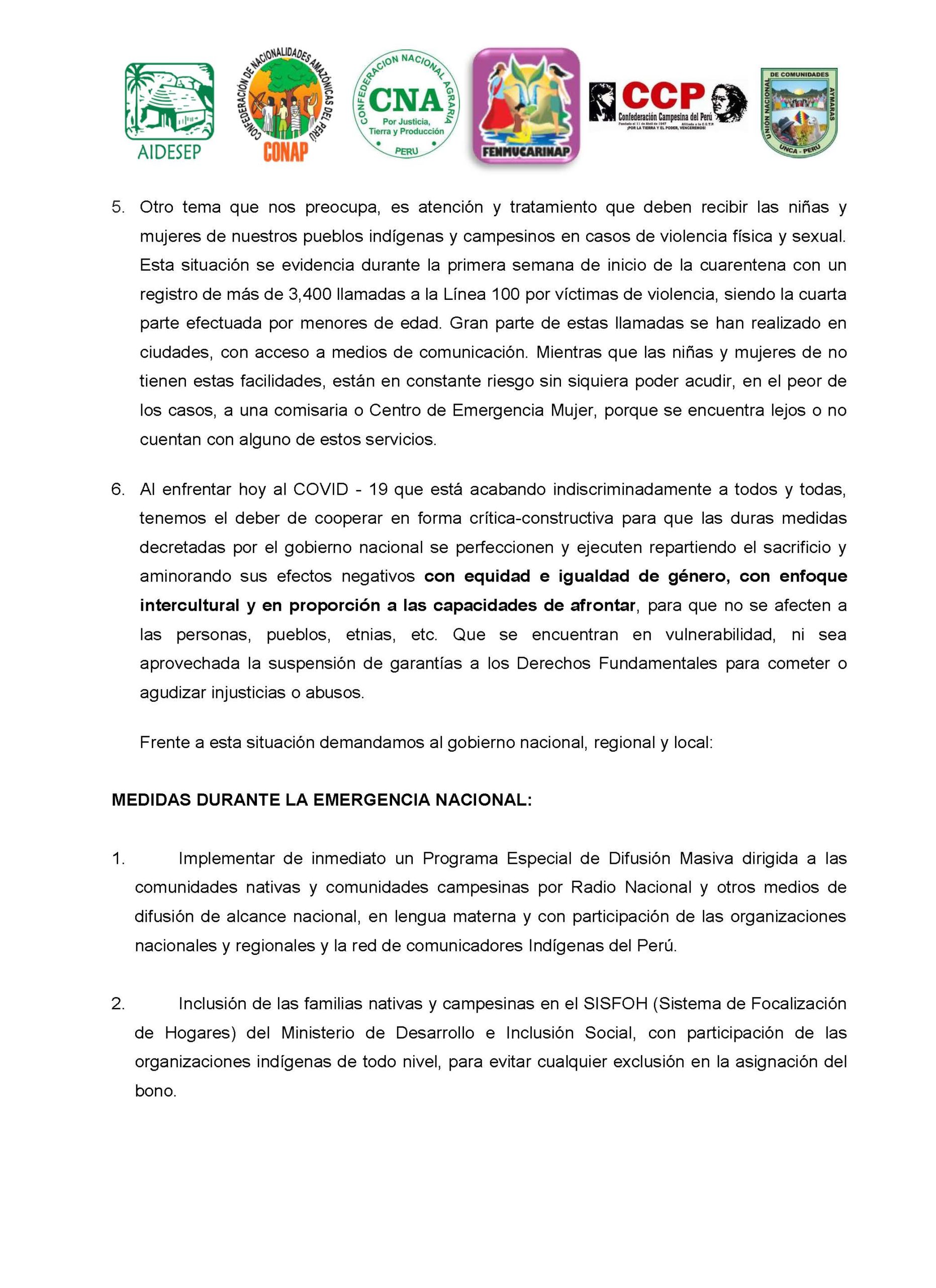 Por ello, el pasado 06 de abril las organizaciones nacionales de los pueblos indígenas Aidesep, la Confederación de Nacionalidades Amazónicas de Perú (Conap), la Confederación Nacional Agraria (CNA), la Federación Nacional de Mujeres Campesinas, Artesanas, Indígenas, Nativas y Asalariadas del Perú (Fenmucarinap), la Confederación Campesina del Perú (CCP) y la Unión Nacional de Comunidades Aymaras (Unca), dirigieron al presidente de la República, congresistas y ministros un pronunciamiento en el que comunicaban sus preocupaciones y planteaban medidas tanto para aplicarse durante la emergencia como para la etapa de reactivación económica.