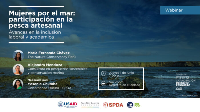 Por eso, con el objetivo de dar a conocer los avances en la inclusión de las mujeres dentro del sector laboral y académico, la Sociedad Peruana de Derecho Ambiental (SPDA) y el Instituto de la Naturaleza, Tierra y Energía (INTE-PUCP) organizan el evento virtual “Mujeres por el mar: participación en la pesca artesanal”, en el marco del proyecto Por la Pesca, que cuenta con el respaldo de la Agencia de los Estados Unidos para el Desarrollo Internacional (USAID) y la Fundación de la Familia Walton (WFF).