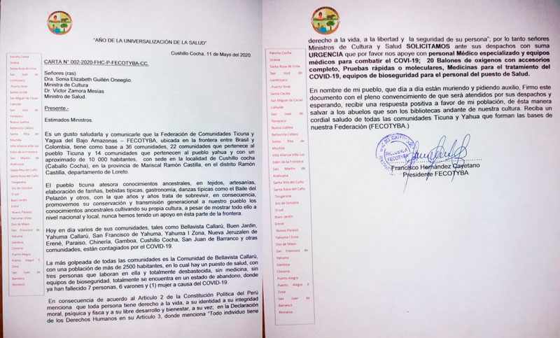“Solo tenemos un personal de salud, están a la deriva sin tener ningún tipo de medicina. Ellos me han llamado con clamor que les envíen alguna medicina, pero no hemos recibido nada, por favor”, son las palabras de Francisco Hernández Cayetano, apu de la Federación de Comunidades Tikuna y Yahuas del Bajo Amazonas (Fecotyba), quien implora ayuda para su pueblo.