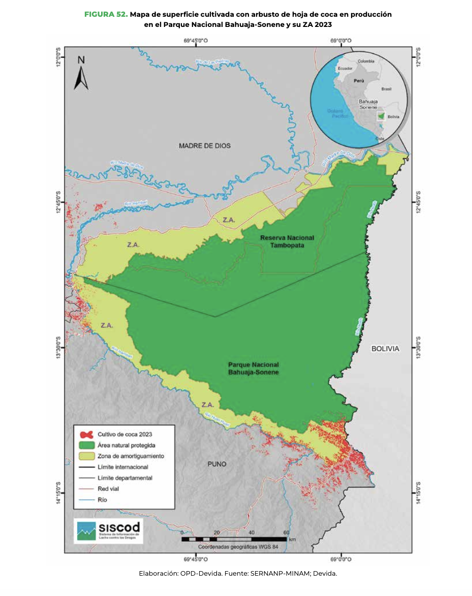De acuerdo con el Monitoreo de cultivos de coca 2023, elaborado por la Comisión Nacional para el Desarrollo y Vida sin Drogas (Devida), el Parque Nacional Bahuaja Sonene, área natural protegida (ANP) ubicada entre Puno y Madre de Dios, registró un aumento de hectáreas de cultivos de hoja de coca, en los últimos cinco años, tanto en su zona de amortiguamiento como en la propia ANP