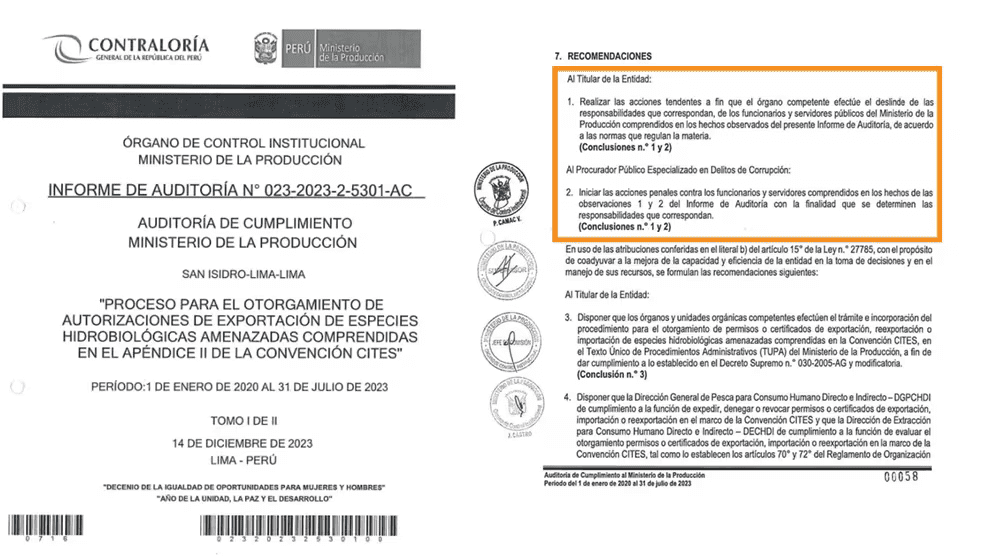 Informe sobre el otorgamiento de permiso de exportación de aletas de tiburón realizado por la Contraloría General de la República del Perú. Foto: Infobae.