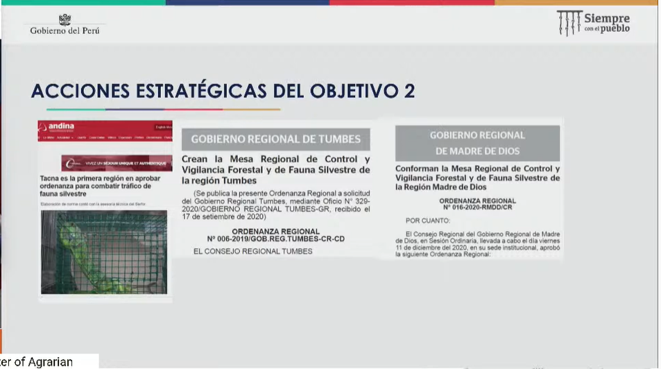 “Las acciones realizadas se enmarcan en la Estrategia Nacional para Reducir el Tráfico Ilegal de Fauna Silvestre en el Perú, cuya ejecución y avance fue sometido a evaluación el año pasado y dio como resultado que existe más del 60 % de cumplimiento de las acciones estratégicas planificadas en el período 2017–2022”, precisó López Córdova.