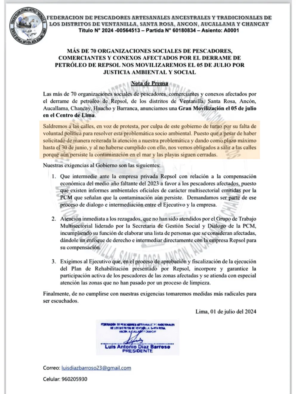 Ante esta situación, la Federación de Pescadores Artesanales Ancestrales y Tradicionales de los distritos de Ventanilla, Santa Rosa, Ancón, Aucallama y Chancay ha convocado a una movilización para el viernes 5 de julio. En total, serán 70 organizaciones de pescadores artesanales y ancestrales, comerciantes y trabajadores de los sectores pesquero y turismo, quienes levantarán su voz en el centro de Lima para reiterar su pedido de compensaciones justas por parte de Repsol.