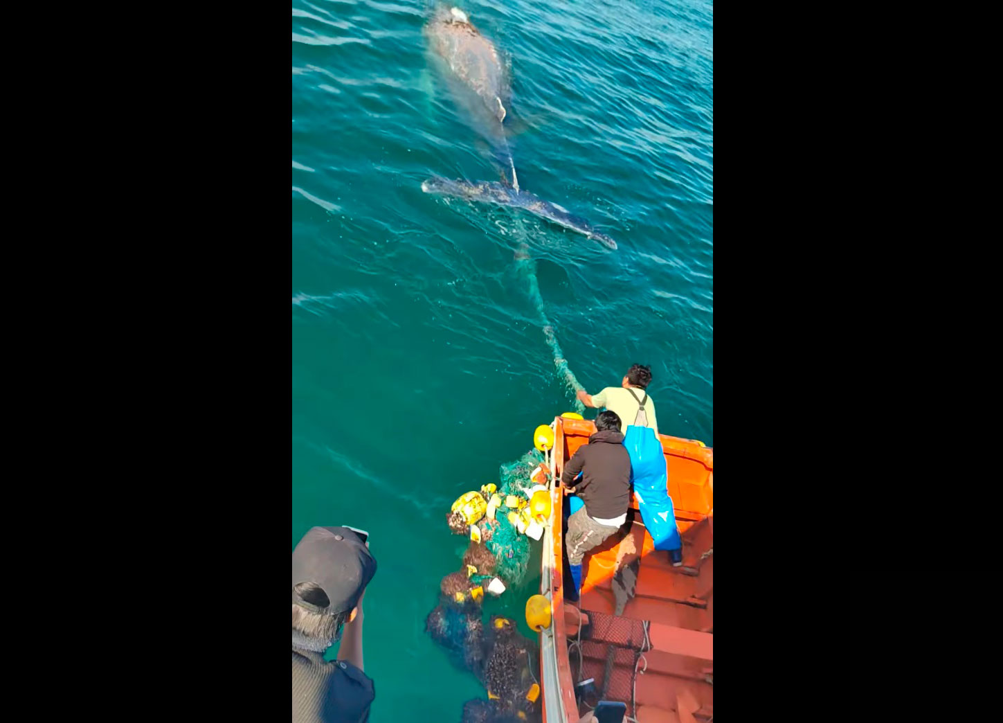 El sábado 5 de octubre, pescadores de Cabo Blanco (Piura) compartieron en redes sociales su encuentro con una ballena atrapada en redes de pesca desechadas durante su faena. A bordo de una chalana, una embarcación más pequeña, dos de los tripulantes pudieron ayudar al cetáceo.
