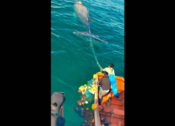 Los pescadores notaron que el nado de la ballena era irregular y tenía dificultades para moverse. “Tiene tanto tiempo que no puede ni moverse. Ya está con percebes la red, hasta la ballenita tiene conchas en el espinazo”, contaba el pescador en el video.