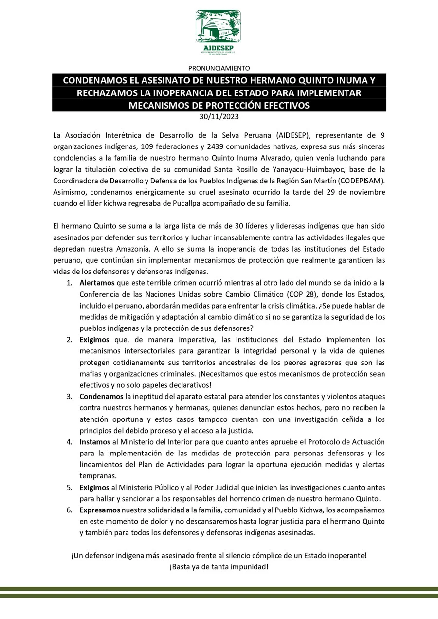La Asociación Interétnica de Desarrollo de la Selva Peruana (Aidesep) condenó este nuevo crimen y exigió al Estado “capturar y sancionar a los responsables de este atroz hecho”. Asimismo, exigió a las instituciones del Estado implementar “los mecanismos intersectoriales para garantizar la integridad personal y la vida de quienes protegen cotidianamente sus territorios ancestrales de los peores agresores que son las mafias y organizaciones criminales”.