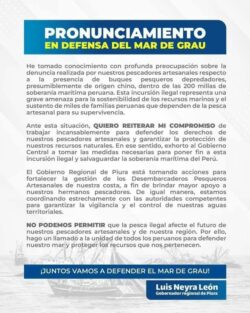 “Esto es un tema a nivel nacional, no solamente de Piura […] Ya hemos hecho una solicitud directamente al Gobierno central para que tome cartas en el asunto. Esto depende de todas las autoridades, no solo del gobernador, hay que pedir a alcaldes y congresistas unidad en favor de los pescadores artesanales”, indicó.