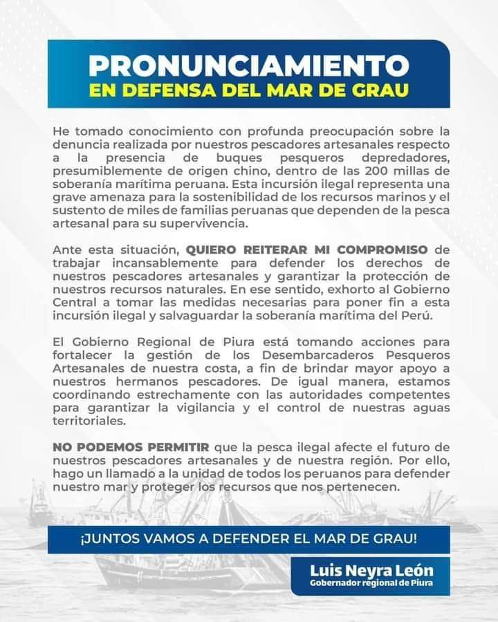 “Esto es un tema a nivel nacional, no solamente de Piura […] Ya hemos hecho una solicitud directamente al Gobierno central para que tome cartas en el asunto. Esto depende de todas las autoridades, no solo del gobernador, hay que pedir a alcaldes y congresistas unidad en favor de los pescadores artesanales”, indicó.