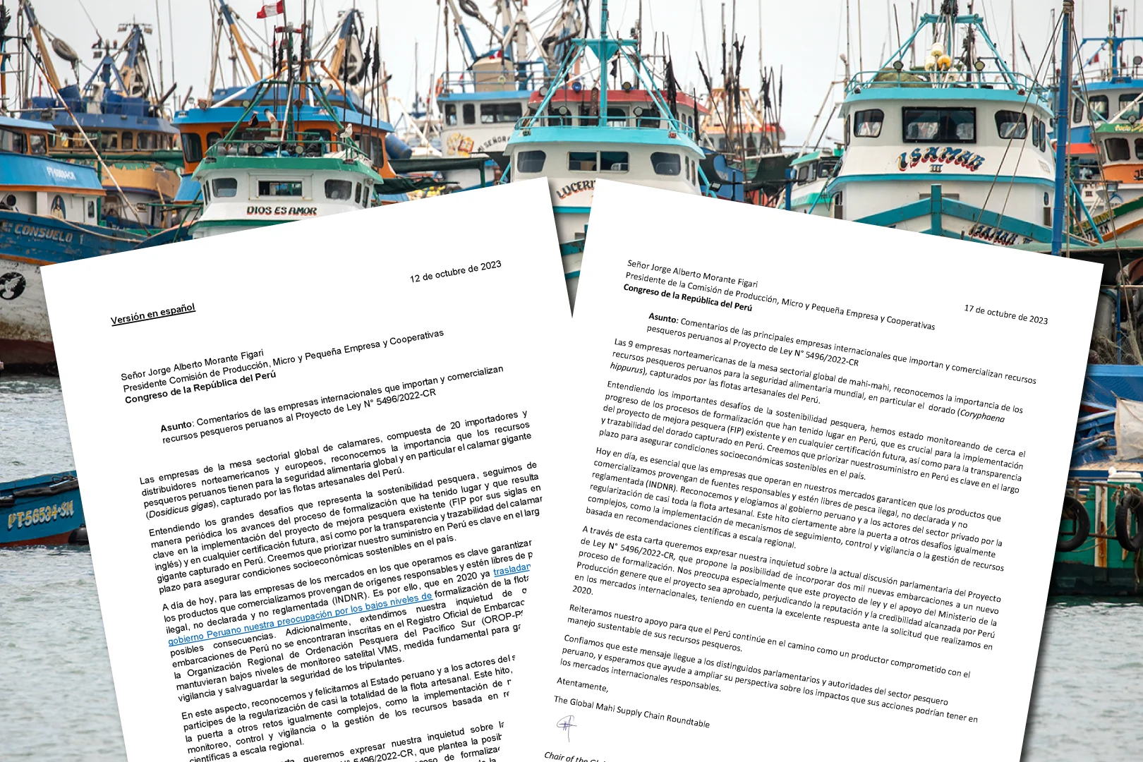 Finalmente, la Mesa Sectorial Global de la Cadena de Suministro de Calamar aprovechó en señalar otros dos puntos que contribuirían a mejorar la imagen de la pesca peruana ante mercados internacionales: el establecimiento del monitoreo satelital en el 100 % de la flota artesanal peruana y la inscripción de las embarcaciones formales en el Registro Oficial de Embarcaciones de la Organización Regional de Ordenación Pesquera del Pacífico Sur (OROP-PS). Mientras que la Mesa Sectorial Global de la Cadena de Suministro de Mahi-Mahi reiteró su apoyo al país para continuar con el manejo sustentable de sus recursos pesqueros.