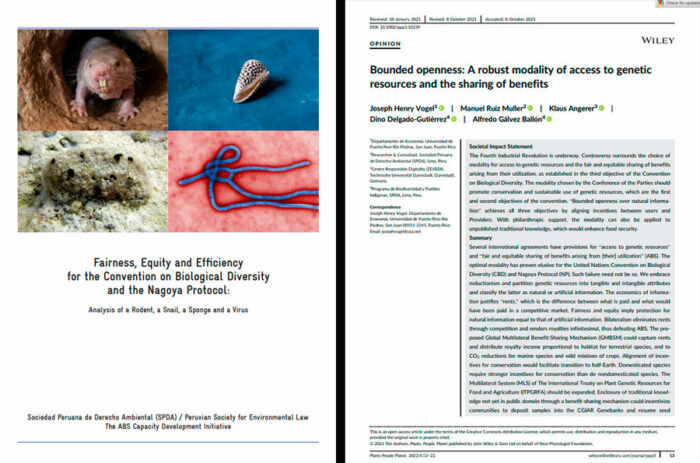 - “Bounded openness: A robust modality of access to genetic resources and the sharing of benefits”, un artículo elaborado en conjunto por Joseph Henry Vogel, Manuel Ruiz, Klaus Angerer, Dino Delgado y Alfredo Gálvez.
