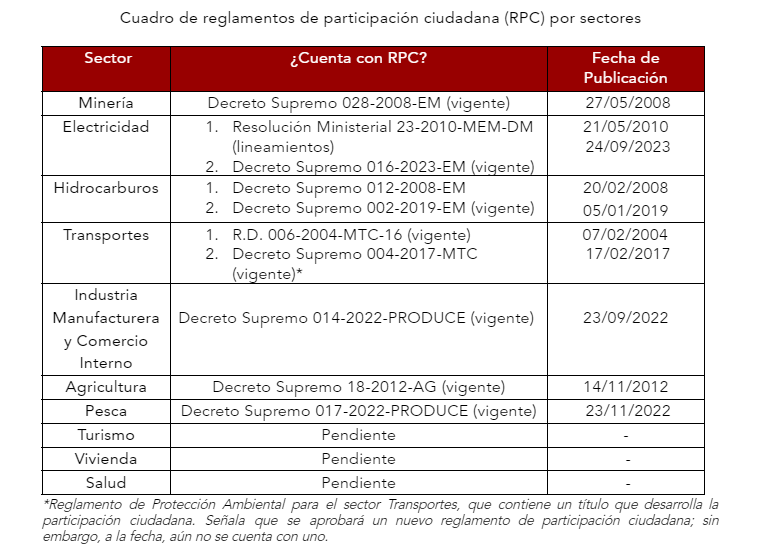 A partir de ello, los sectores productivos y extractivos han desarrollado, en los últimos años, distintos marcos regulatorios sectoriales en materia de protección ambiental y de participación ciudadana, en el que regulan la forma de implementar mecanismos de participación ciudadana en los procesos de evaluación de impacto ambiental, y han aprobado marcos específicos sobre cómo ejercer este derecho.