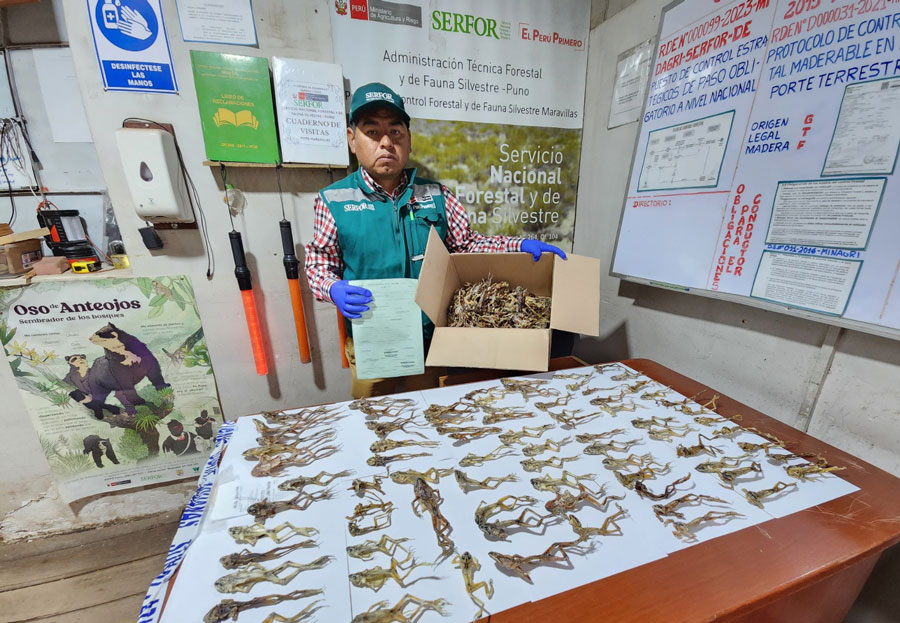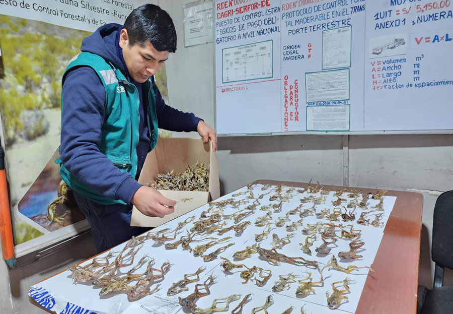 El Servicio Nacional Forestal y de Fauna Silvestre (Serfor) y Aduanas decomisaron 390 ranas del Titicaca (Telmatobius culeus) disecadas durante una inspección de rutina en la carretera a la altura de la comunidad de Huataquita, distrito de Cabanillas (Puno).