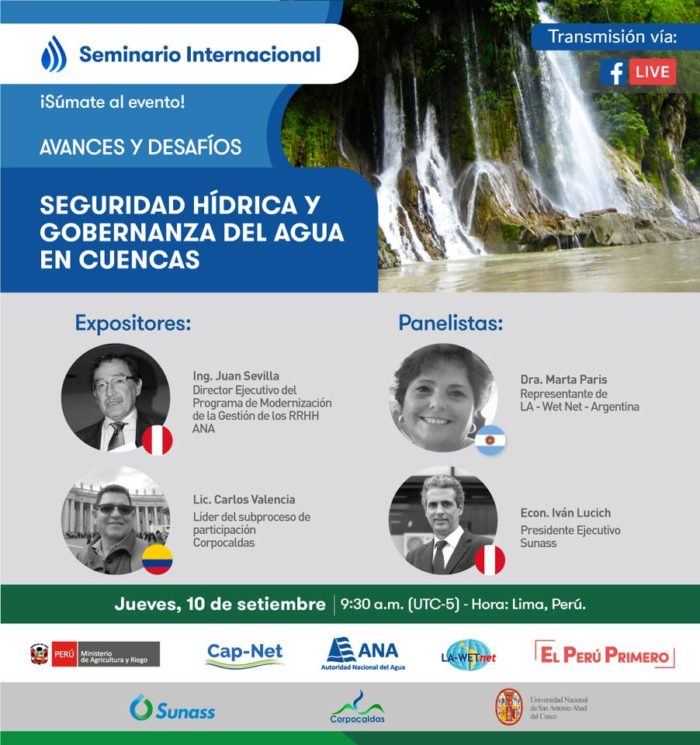 El próximo jueves 10 de setiembre, la Autoridad Nacional del Agua (ANA) realizará el seminario internacional “Seguridad Hídrica, Gestión Adaptativa y Gobernanza del Agua en Cuencas: Avances y desafíos”, dirigido al público en general y de manera gratuita.