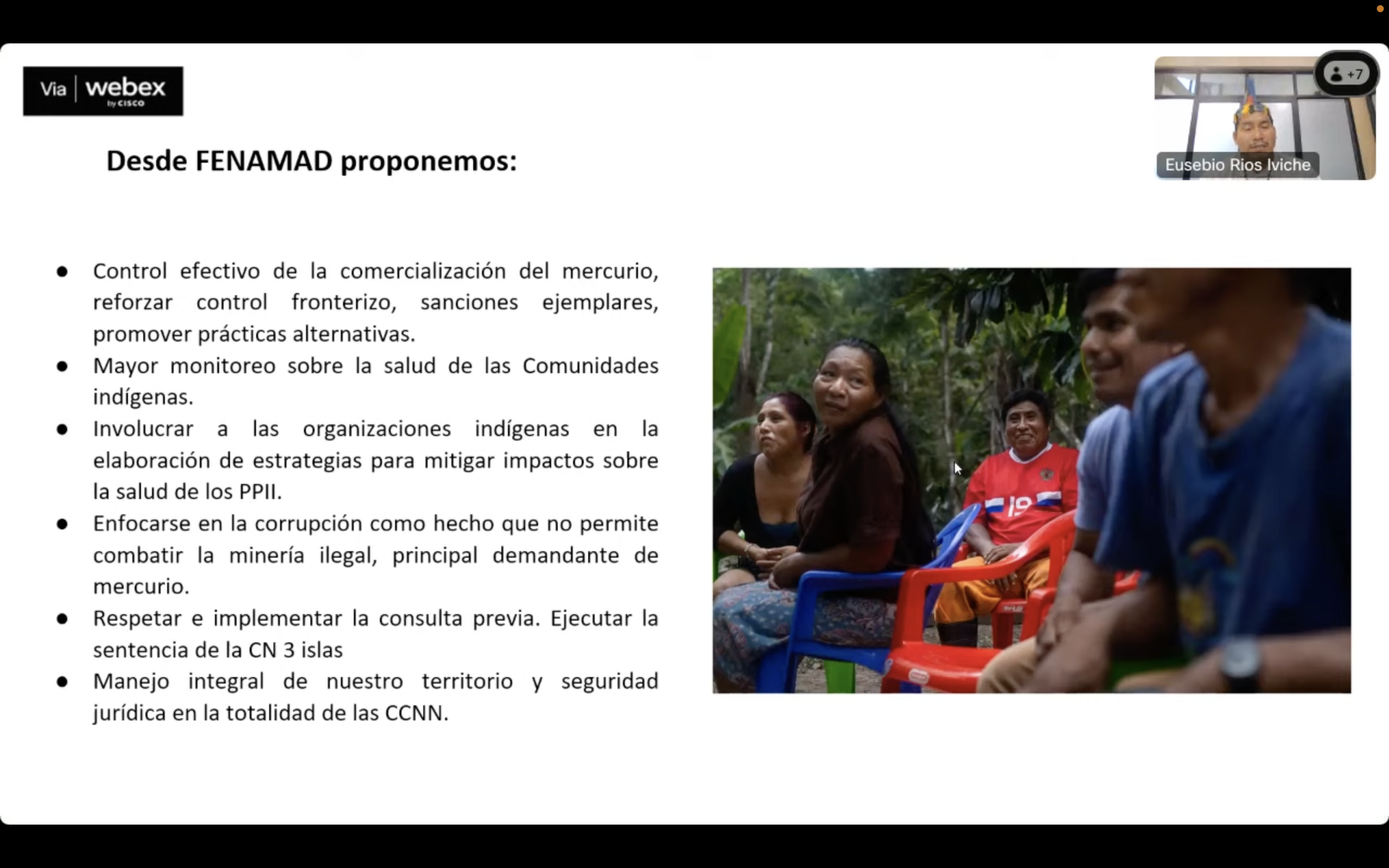 Eusebio Ríos Iviche, vicepresidente de la Federación Nativa del río Madre de Dios y Afluentes (Fenamad), fue el encargado de trasladar la preocupación de las personas que viven en las comunidades nativas por el incremento de la minería ilegal y la poca respuesta del Estado peruano para enfrentarla. Además, mencionó el estudio publicado en 2016 por el Ministerio de Salud (Minsa) sobre los niveles de contaminación por mercurio a los que están expuestos los habitantes de esta región: el 41 % de la población tenía en sus organismos valores superiores a los límites permisibles.