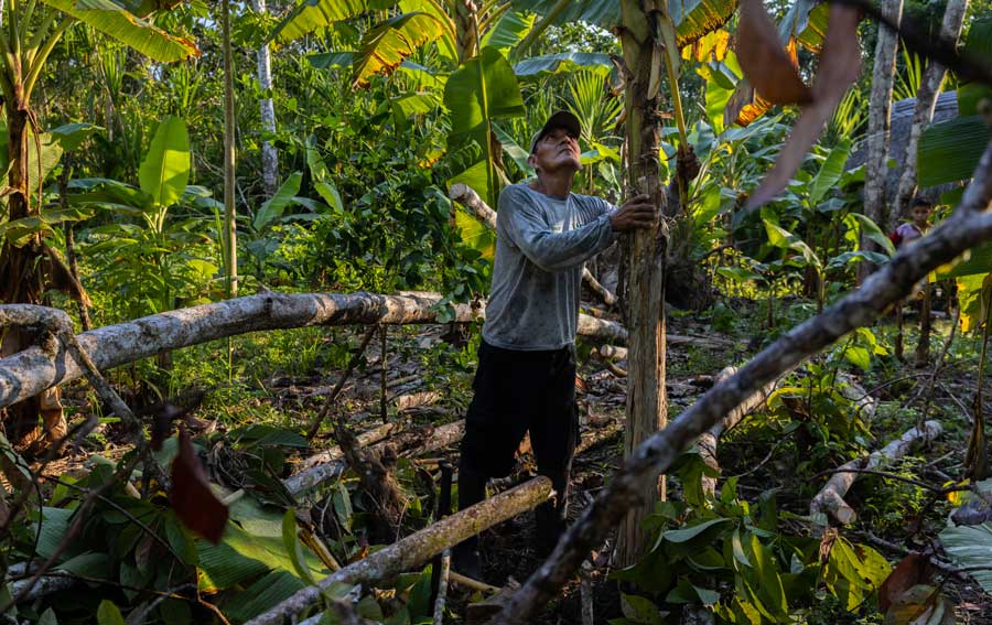 Luego de esta primera parada, ya con un poco más de luz solar, se dirigen hacia sus chacras, terrenos ubicados en una zona inundable en la que siembran y cosechan yuca, arroz, plátano, entre otros productos en temporada de vaciante, es decir, cuando el río baja. En el camino, el apu Eleodoro Ahuanari recalca la importancia de contar con un título y zonificación sobre sus territorios para poder realizar sus actividades de subsistencia con la tranquilidad de tener respaldo jurídico para defender sus tierras de cualquier intruso.
