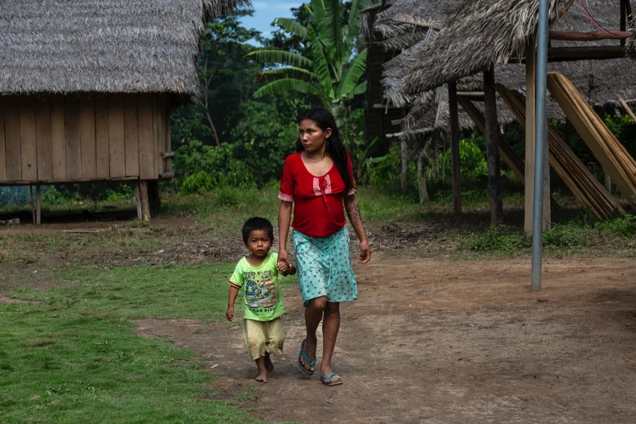Luz Mari Ruiz Santos (asheninka) se alista para iniciar el día en la CN Dulce Gloria. La pintura facial hecha a base de achiote es principalmente usada como bloqueador para proteger el rostro del sol. Cada individuo se pinta un diseño distinto, algunos incluso se pintan las letras de su nombre en el rostro.