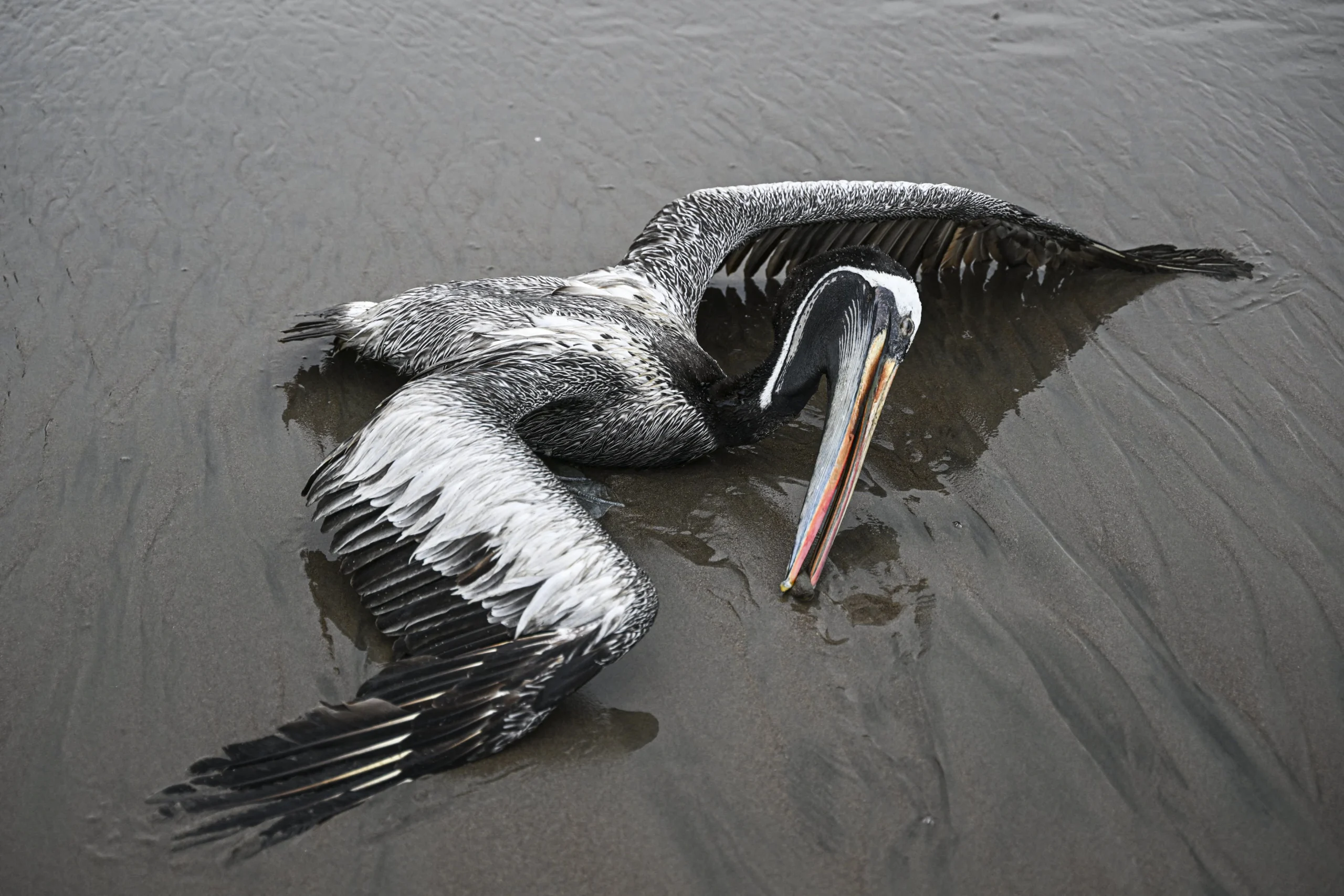 A pelican suspected to have died from H5N1 avian influenza is seen on a beach in Lima, on December 1, 2022. - The highly contagious H5N1 avian flu virus has killed thousands of pelicans, blue-footed boobies and other seabirds in Peru, according to the National Forestry and Wildlife Service (SERFOR). (Photo by Ernesto BENAVIDES / AFP)