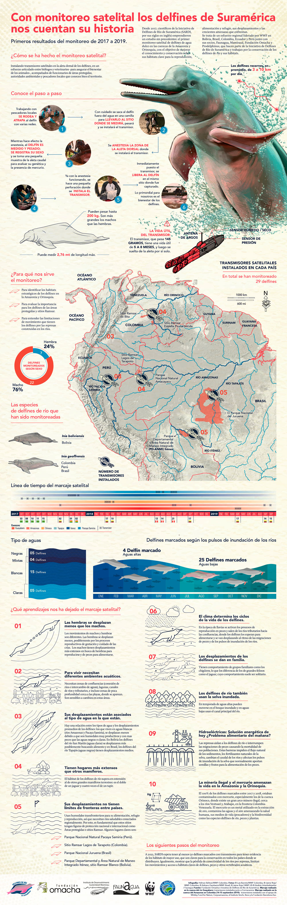 Este trabajo fue posible gracias a la Iniciativa de Delfines de Río de Suramérica (SARDI, por sus siglas en inglés), conformada por las organizaciones Faunagua, Fundación Omacha, Mamirauá, Prodelphinus y WWF. El grupo promueve la conservación de los delfines de agua dulce y sus hábitats con estrategias como el monitoreo satelital.