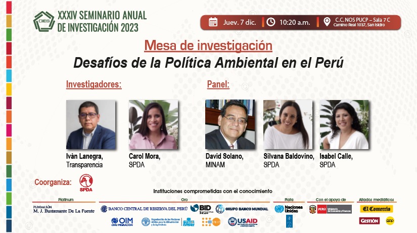 El jueves 7 de diciembre, en la mesa de investigación Desafíos de la Política Ambiental en el Perú, se analizarán las capacidades ambientales del gobierno, así como la articulación territorial con gobiernos regionales y locales. Asimismo, se tratará sobre el fortalecimiento de entidades ambientales como el Ministerio del Ambiente (Minam) y la importancia de la inversión para mejorar la gestión ambiental en el país.