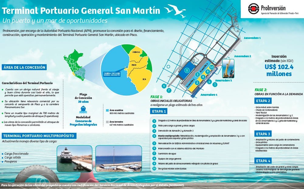 Según Senace, el proyecto multipropósito orientado a manejar cargas diversas y pasajeros, fue concesionado a favor de Consorcio Terminal Portuario Paracas S.A. (TPP) el 2014 por ProInversión, previa compatibilidad otorgada por el Servicio Nacional de Áreas Naturales Protegidas por el Esytado (Sernanp) por constituirse un derecho preexistente. La vida útil del proyecto es de 30 años.