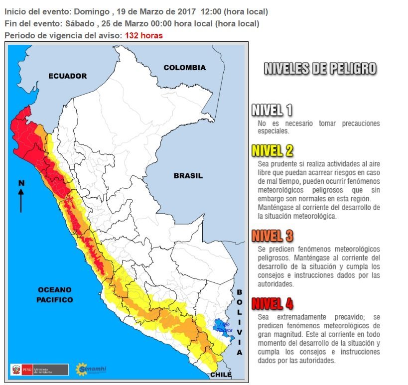 En la costa norte (La Libertad, Lambayeque, Piura y Tumbes) se presentarán lluvias de fuerte magnitud acompañadas de descargas eléctricas. Estas serán más intensas entre el 19 y el 23 de marzo. En Piura y Lambayeque, los valores superarían los 150 mm/día (1 mm equivale a un litro por metro cuadrado), mientras que en la zona costera de Piura, Lambayeque, Tumbes y el interior de La Libertad, se podría superar los 50 mm/día.