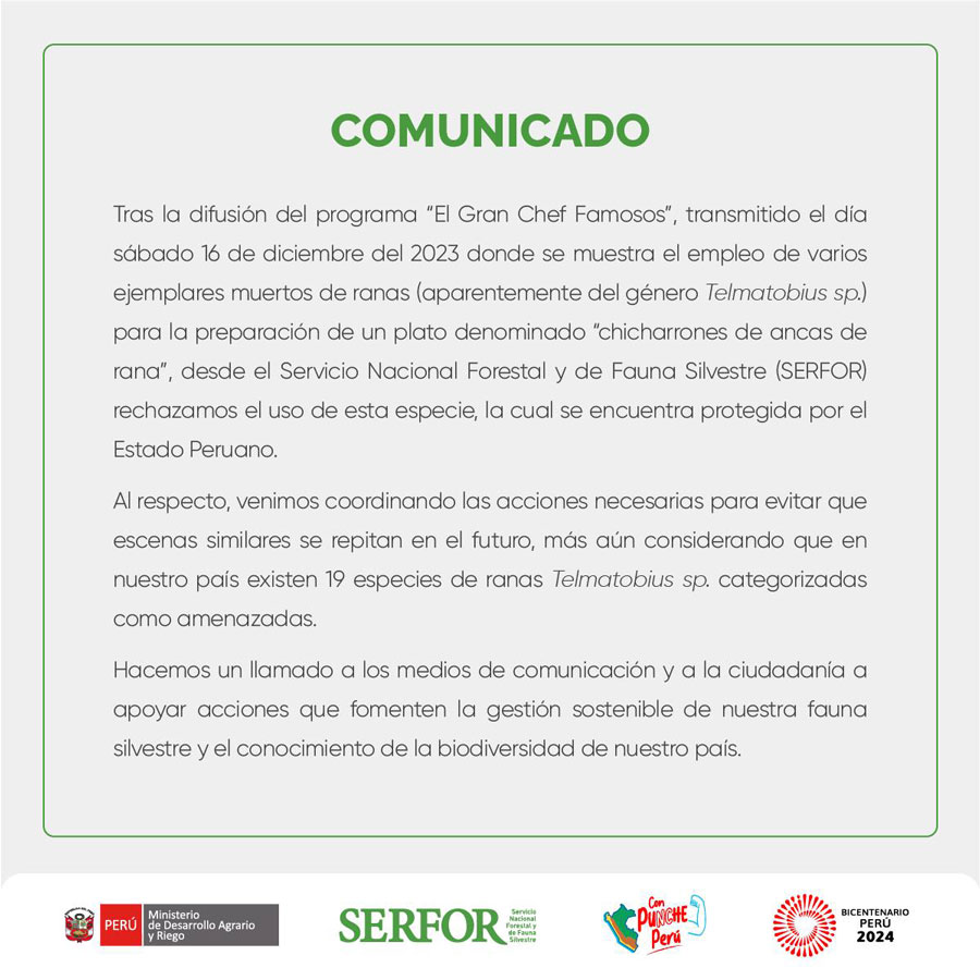 El Servicio Nacional Forestal y de Fauna Silvestre (Serfor) emitió un comunicado donde rechaza el uso de especies silvestres en El Gran Chef Famosos de Latina. En una de sus emisiones, el programa de televisión presentó ejemplares de ranas muertas, que serían de la especie Telmatobius sp., para preparar “chicharrones de anca de ranas”.