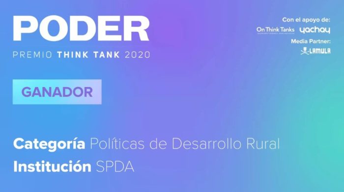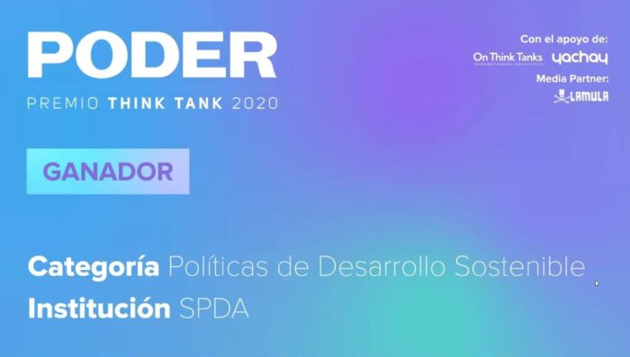 Este galardón, entregado cada año, celebra y visibiliza el buen trabajo de los centros de investigación aplicada en el Perú. El reconocimiento es entregado por la Revista PODER, On Think Tanks y Yachay. En esta ocasión, la SPDA ganó en las categorías «Política de Desarrollo Sostenible» e «Investigación sobre Desarrollo Rural».
