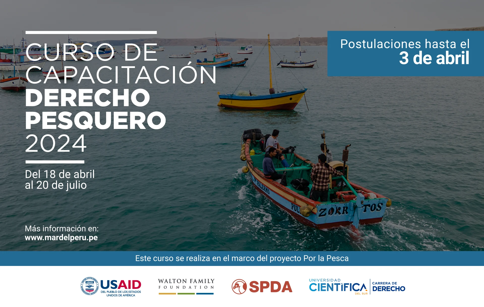 Las becas y el curso se implementarán en el marco del proyecto Por la Pesca, que busca reducir la pesca ilegal, no declarada y no reglamentada a través de prácticas pesqueras formales y responsables; y cuenta con el respaldo de la Agencia de los Estados Unidos para el Desarrollo Internacional (USAID) y la Fundación de la Familia Walton.