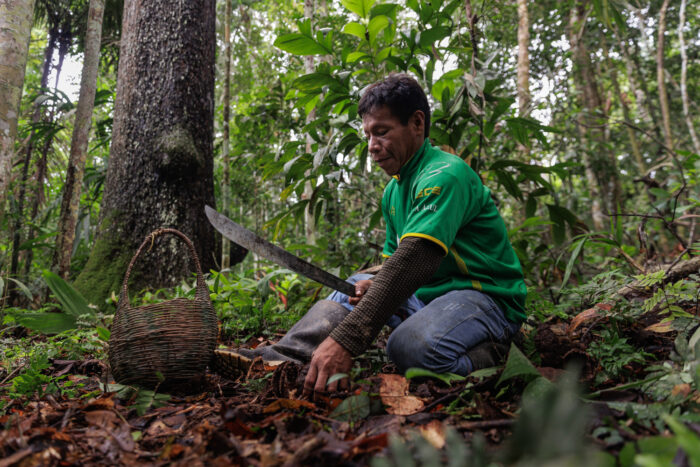 En un momento la líder del grupo, Débora Peña, natural de la comunidad nativa Yomibato y esposa del hermano de Javier, se detiene alrededor de una palmera ungurabi. Nos cuenta que ahí vive el gusano suri. “Se puede comer asado, con yuca, patarashca, frito o crudo”, cuenta mientras hunde su machete en la madera. La dejamos a ella y un grupo y continuamos el camino hasta llegar al castañal. Hasta la fecha han registrado huanganas, una especie de chanchos que andan en manadas, el sajino, venados y monos maquisapa y machín.