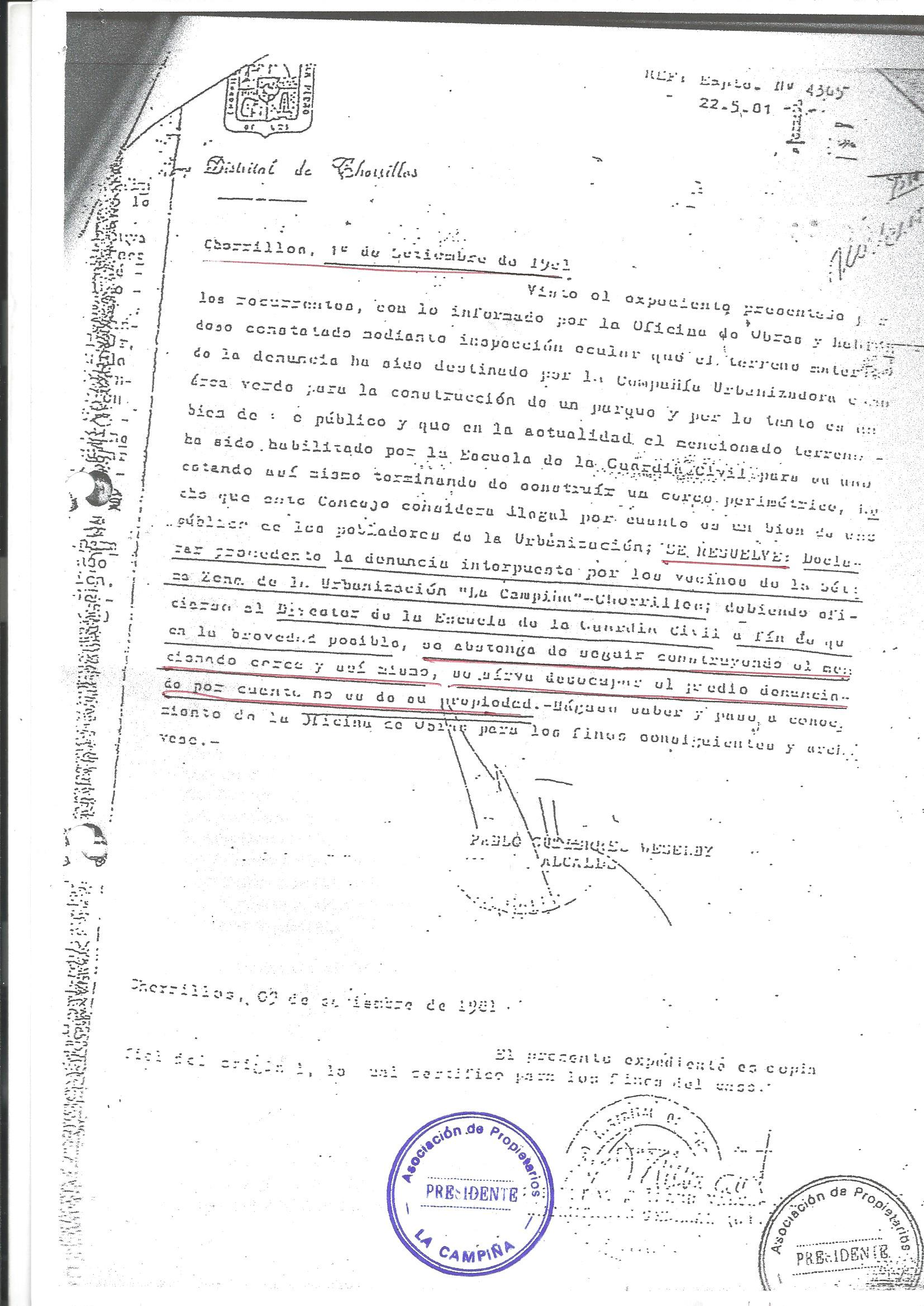 De tanto ir y venir durante más de treinta años con sus reclamos en diferentes instituciones, los vecinos de La Campiña lograron en el 2009 una sentencia a favor, por parte de la Sétima Sala Civil del Poder Judicial, el cual ordenaba suspender “la utilización del inmueble para fines distintos a los de un parque público”. (VER DOCUMENTO)