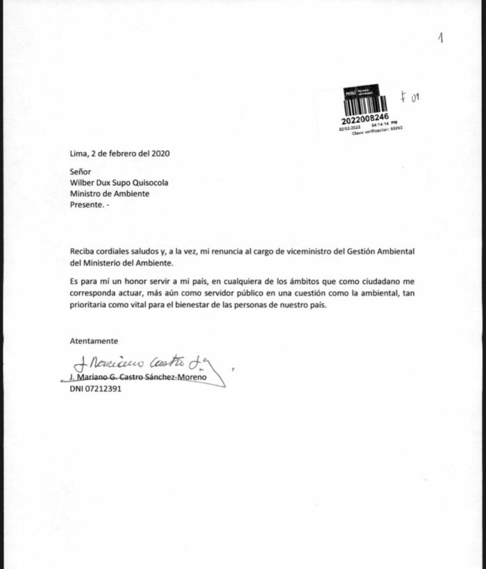 Un día después de la juramentación de Wilber Dux Supo, el pasado 1 de febrero, como ministro del Ambiente del gabinete liderado por Héctor Valer, el renunciante viceministro Mariano Castro Sánchez-Moreno presentó su carta de renuncia tras ocupar el cargo desde noviembre de 2020 durante la gestión del ministro Gabriel Quijandría. De acuerdo a la carta dirigida al nuevo titular de la cartera ambiental, Castro Sánchez indicó que ha sido un honor para él servir al país.