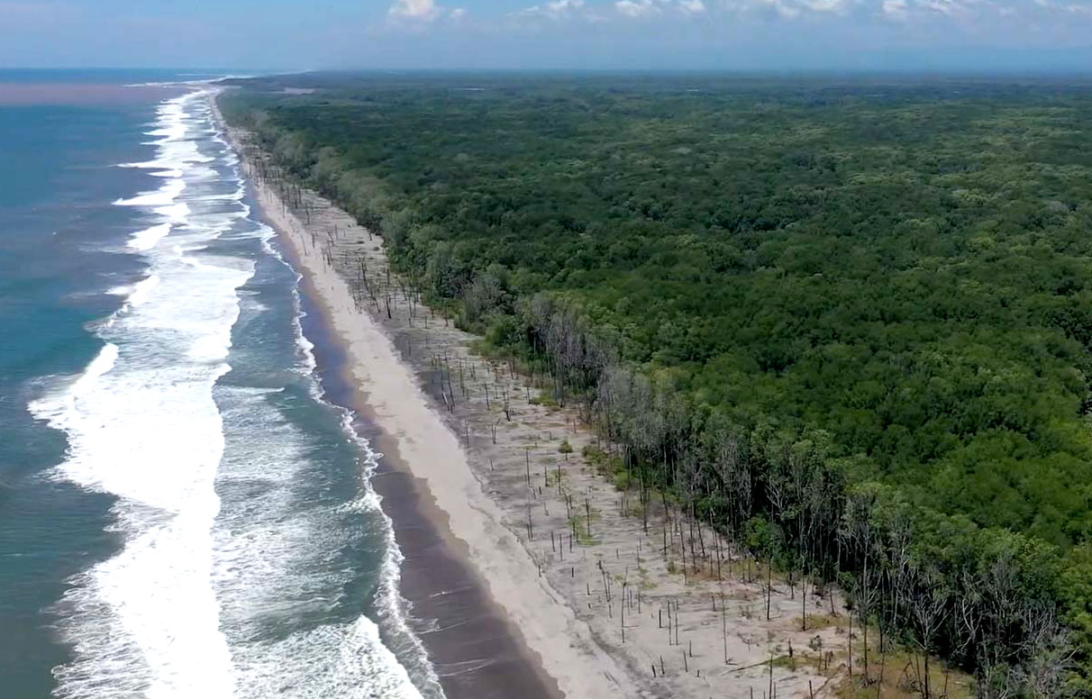 La Bahía de Jiquilisco alberga a uno de los manglares más extensos de Centroamérica. Comprende 55 km de costa y más de 19 mil hectáreas de bosque de mangle. Sin embargo, una franja de más de 4 km, con 22 hectáreas de mangles, se ha convertido ahora en un cementerio.